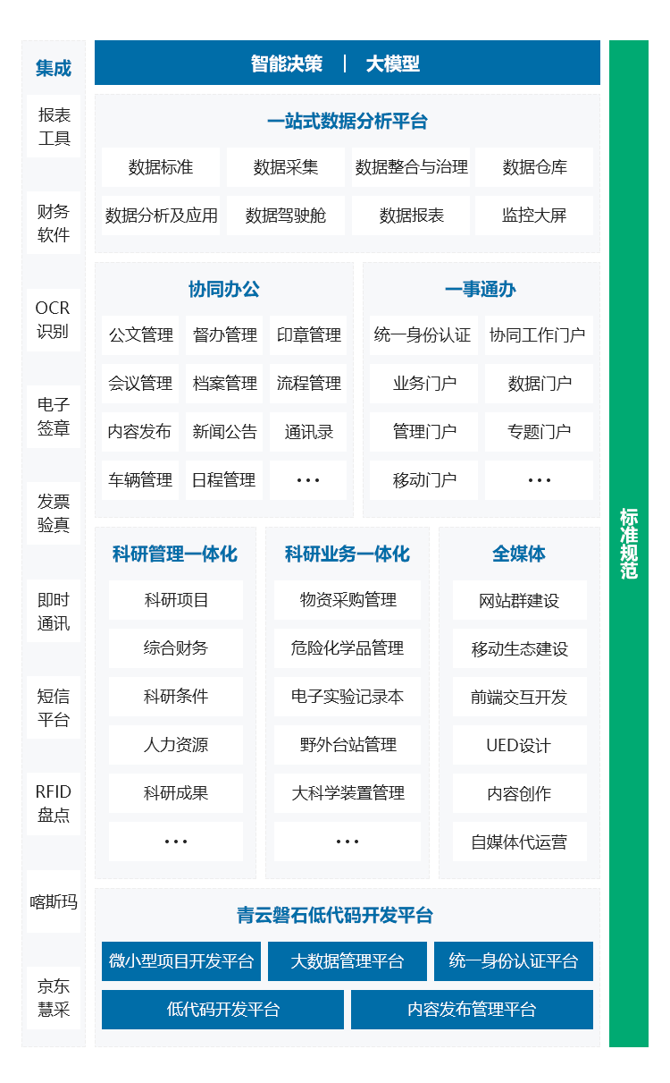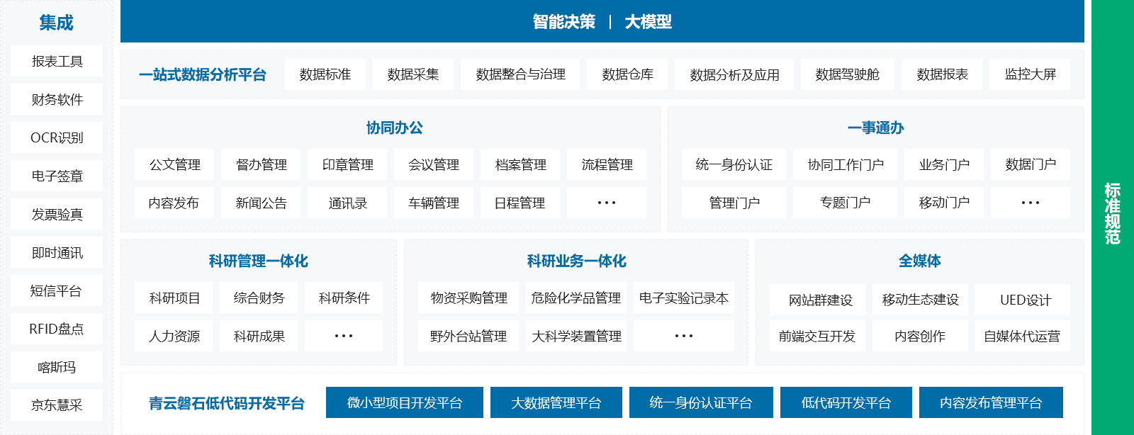 輔助決策平臺是基于科研數(shù)據(jù)和科研指標(biāo),利用先進(jìn)算法、可視化、大模型等技術(shù),為科研決策者提供數(shù)據(jù)支持和建議的信息化系統(tǒng)。平臺為科研單位建立數(shù)據(jù)標(biāo)準(zhǔn),搭建數(shù)據(jù)中臺,將內(nèi)外部科研數(shù)據(jù)進(jìn)行有機融合,讓科研決策者一手掌握本單位科研項目、經(jīng)費、資產(chǎn)、科研成果、人才隊伍建設(shè)情況,了解國家/同行業(yè)單位發(fā)展趨勢,找準(zhǔn)本單位科研水平所處位置,制定人才引進(jìn)、經(jīng)費申請、資源配置相關(guān)制度和戰(zhàn)略規(guī)劃,從而提升本單位整體科研能力。